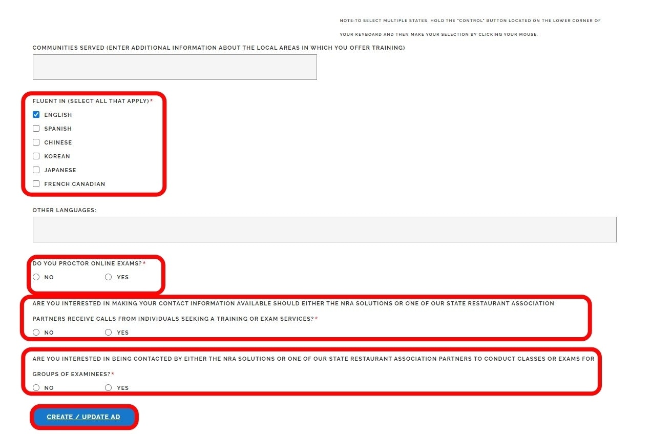 Fill out all required fields in the advertisement form. Select the Create/Update AD icon when you have finished filling out the form.