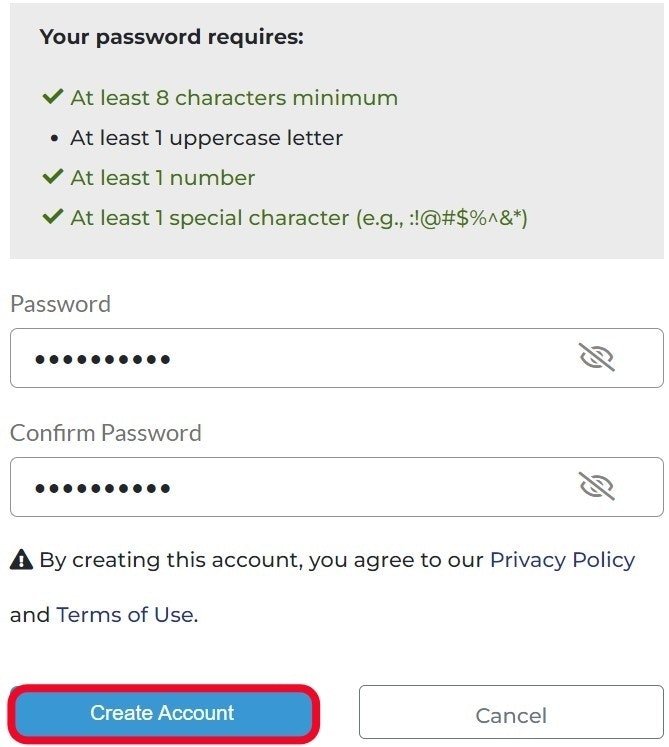 After entering the required information, select Create Account. You will be automatically logged in and granted access to all account features.