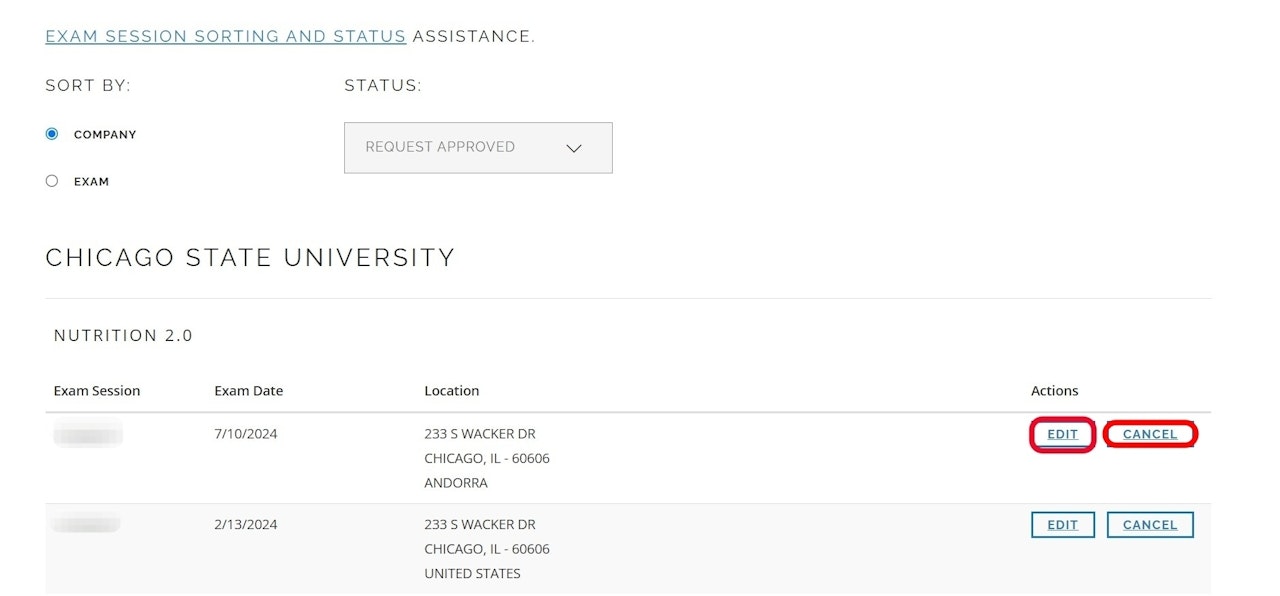 Under Actions, select Edit or Cancel to choose a new exam date and save your exam session.