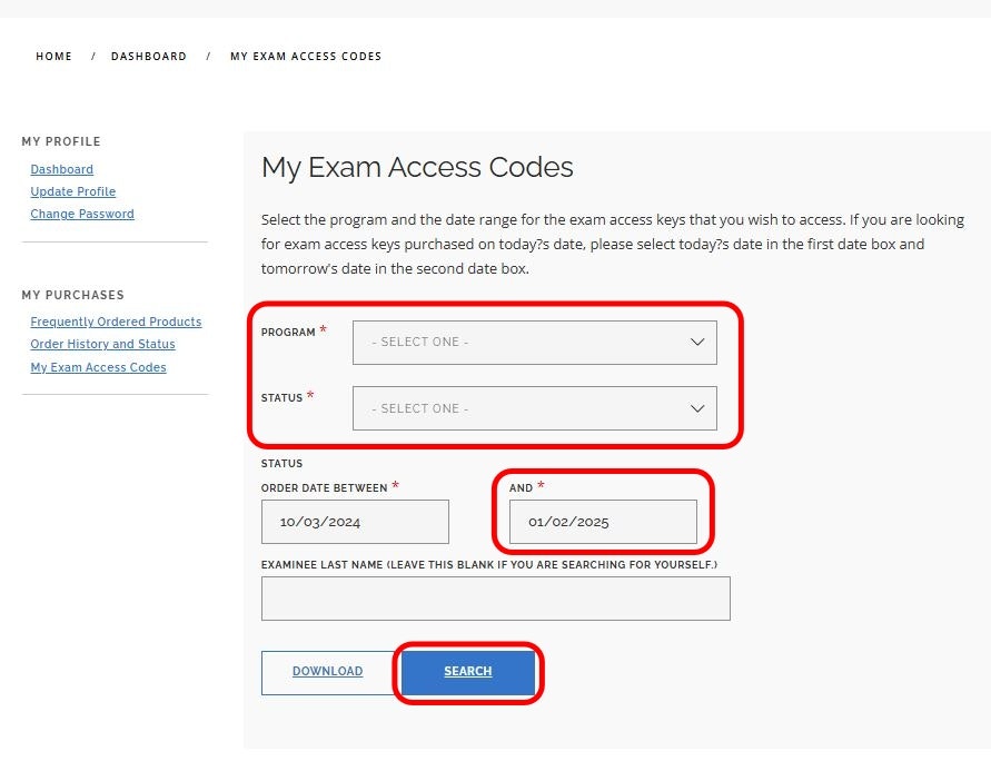 Select the Program Type and Status of the code, then select Search. Do not enter a last name when searching for unused codes.