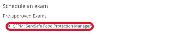 Under the Pre-approved Exams section, select the ServSafe Food Protection Manager Exam link.