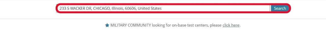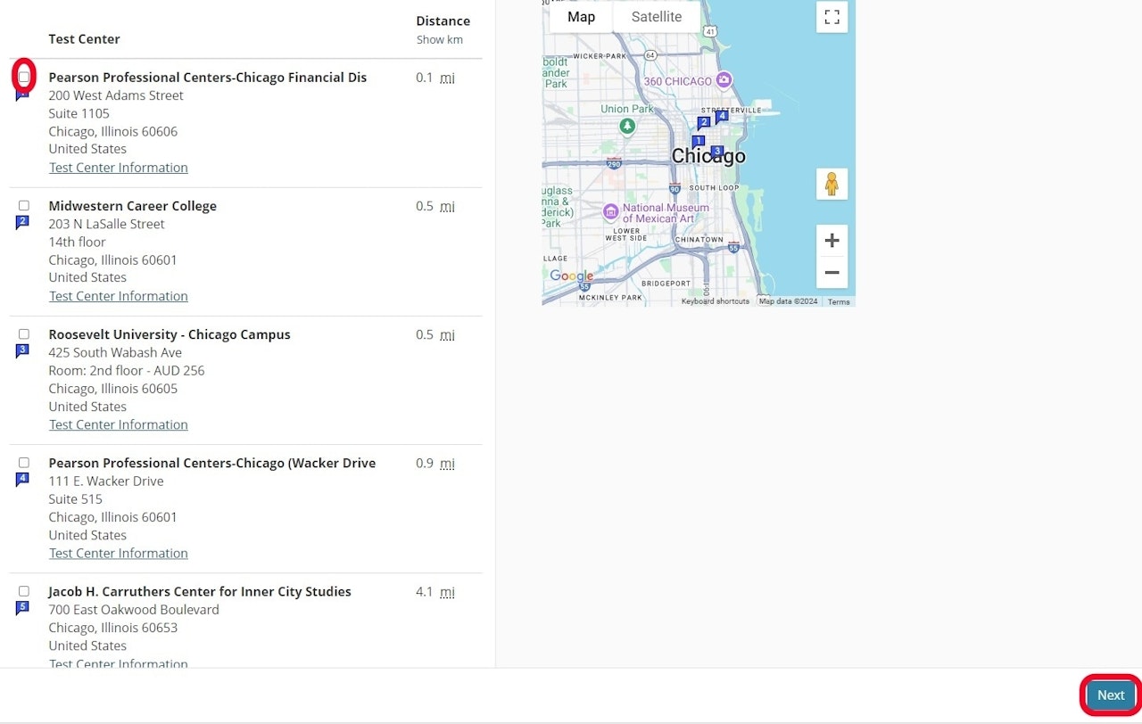 Search for a testing center, check the box to select your preferred one, and select Next.