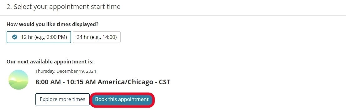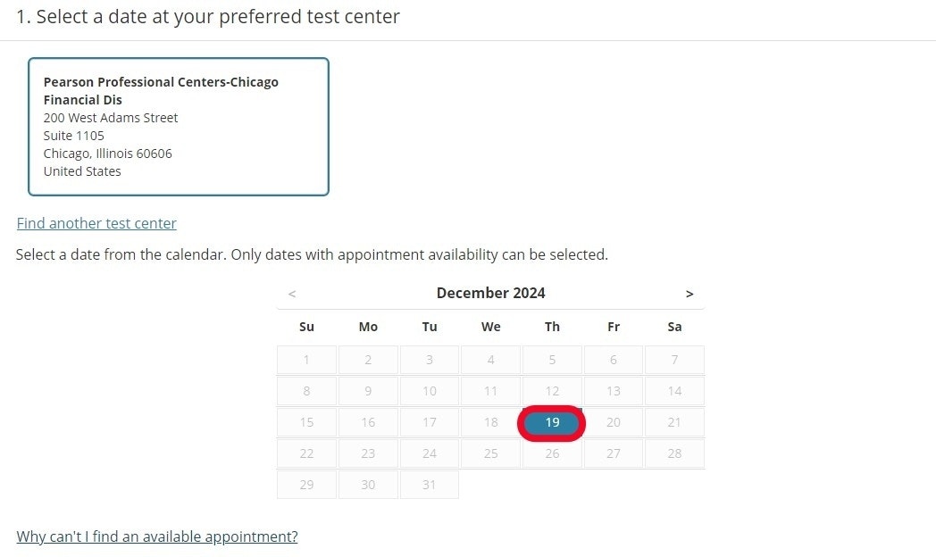 Select a date and time for your exam, then select Book This Appointment. If unavailable, choose a different testing center for more options.