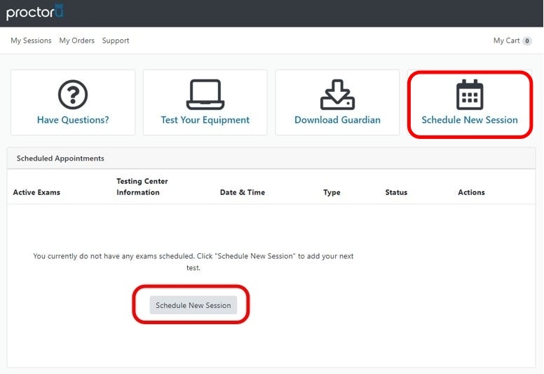 Log into your ProctorU account and select Schedule New Session to schedule your exam.