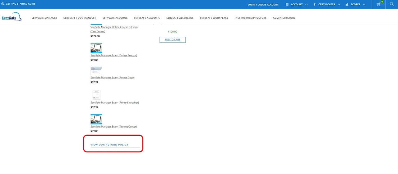 Our refund policy is available on ServSafe.com, product description pages or in the Terms of Sale page during checkout.